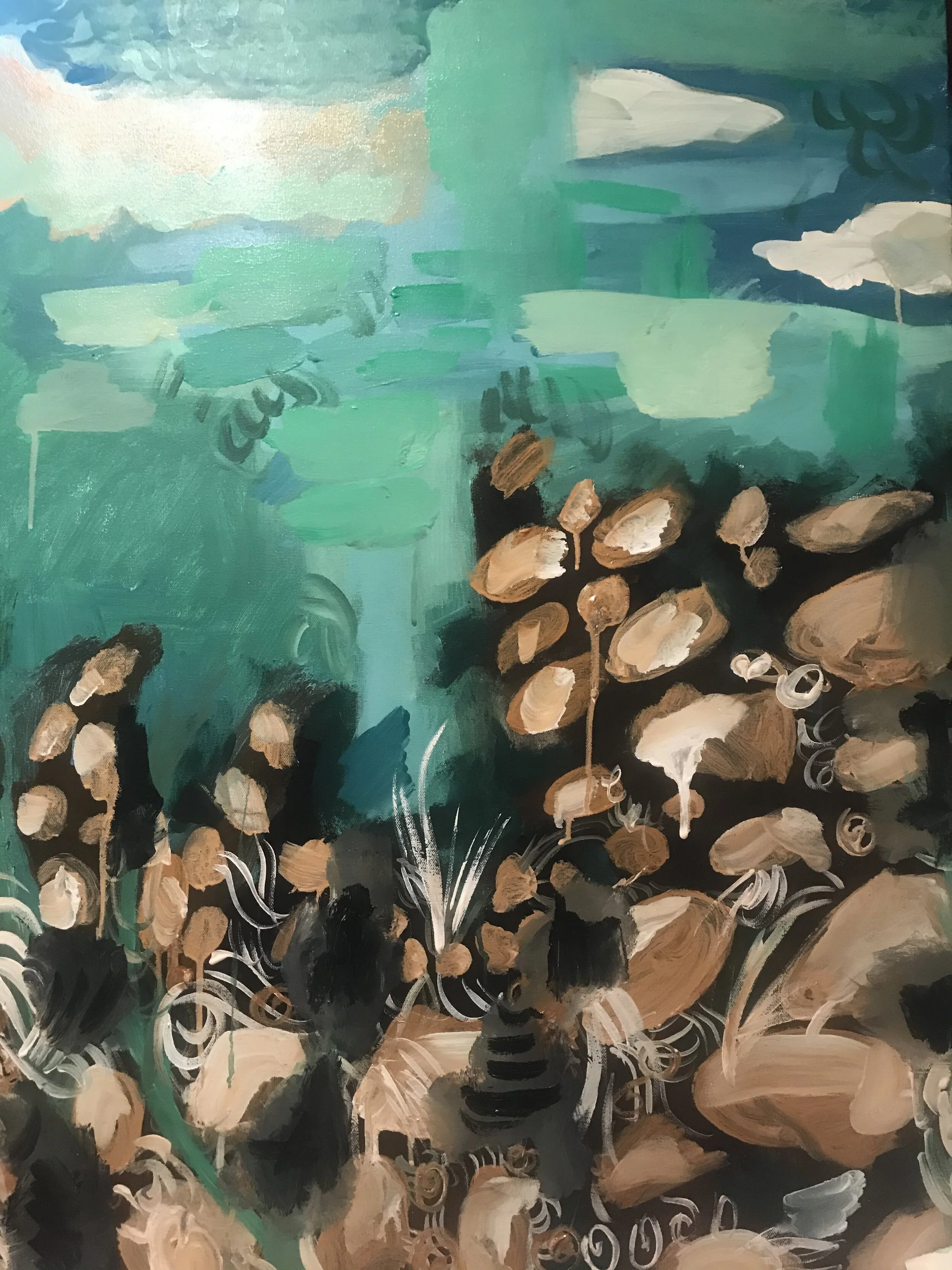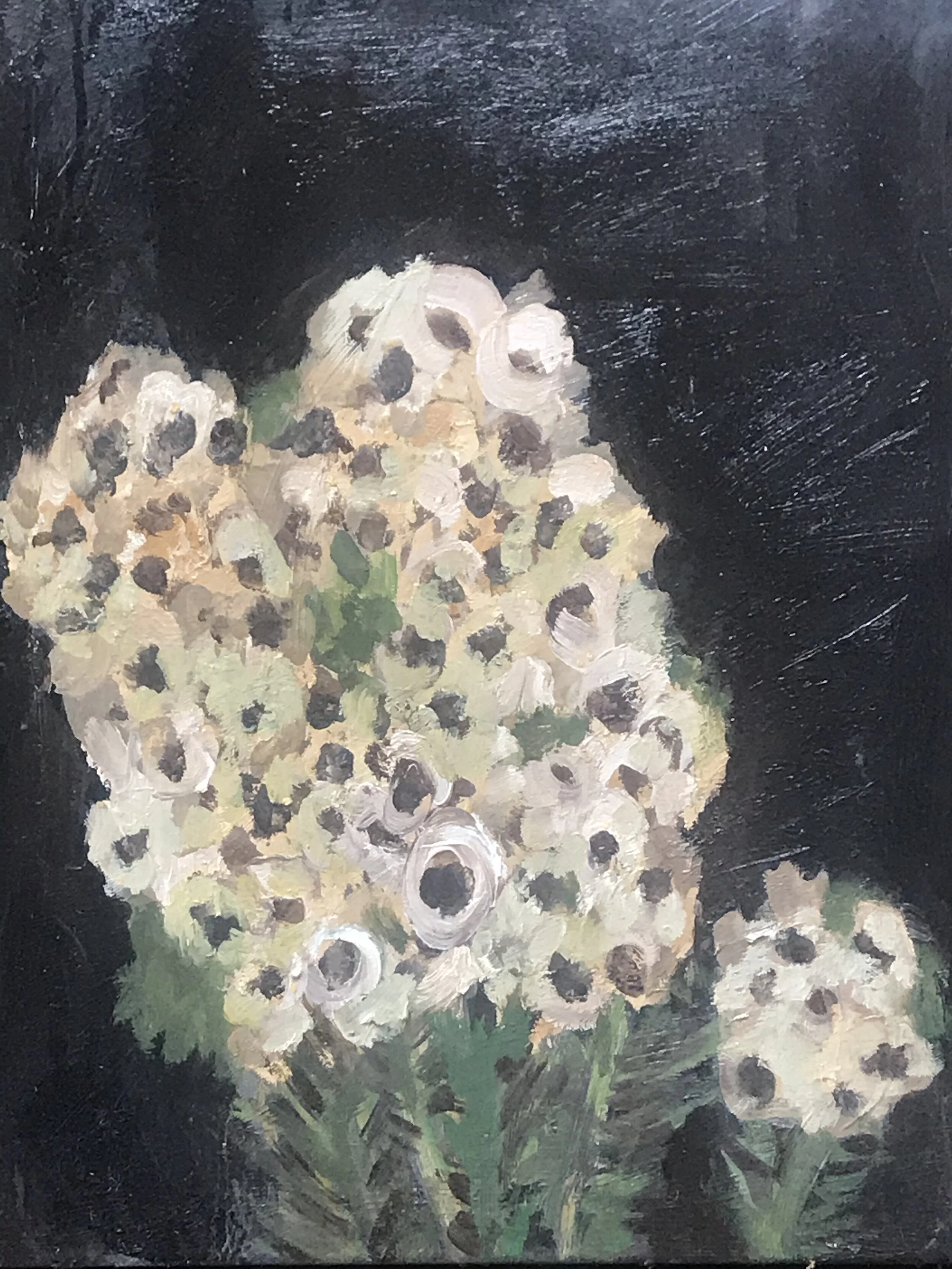 The last five years are for me a collection of paintings about ideas of grief and loss. Using nature and flowers, quite often, I find that I can speak about pain while also keeping my head above the water by the grace of nature and its beauty, keeping me afloat. Flowers specifically are tools for me to interact with ideas in life and death, and man vs. nature.